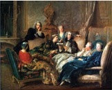 A gathering of stimulating people of quality under the roof of an inspiring hostess or host, partly to amuse one another and partly to refine their taste and increase their knowledge through conversation and readings...The word salon first appears in French in 1664 (from the Italian word sala, used to designate the large reception hall of Italian mansions). Before the end of the 17th century, these gatherings were frequently held in the bedroom (treated as a more private form of drawing room): a lady, reclining on her bed, would receive close friends who would sit on chairs or stools drawn around...The expression ruelle, literally meaning "little street", designates the space between a bed and the wall in a bedroom, and more generally the entire bedroom; it was used commonly to designate the gatherings of the "précieuses", the intellectual and literary circles that formed around women in the first half of the 17th century...The 18th century salons brought together Parisian society and the progressive philosophes who were producing the Encyclopédie.