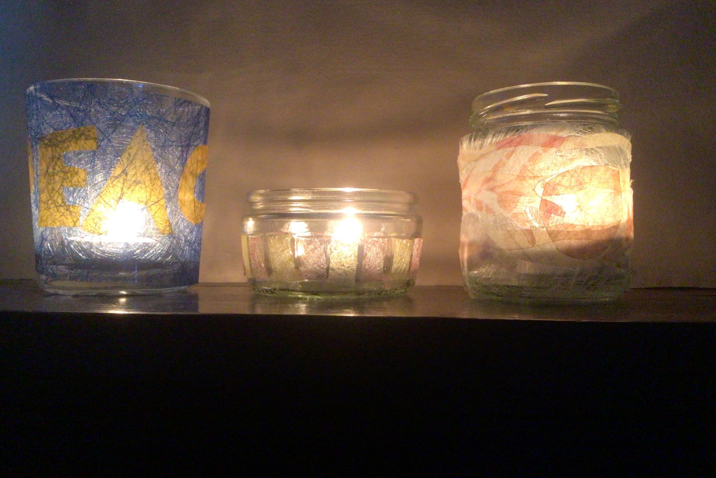 We spend an hour cutting paper into shapes that we stick onto jars, then we place candles inside the jars and watch the flames flicker. The littlest one cuts out blue letters spelling