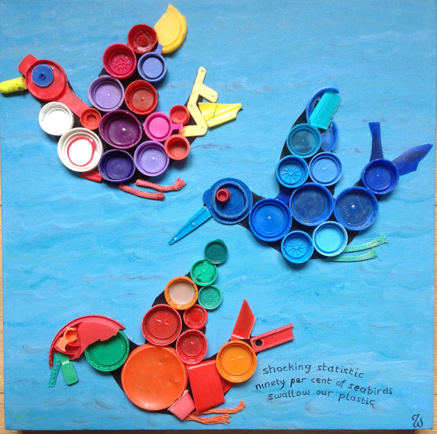By then I ‘d moved back to the Essex coast, after 34 years in West Yorkshire. Content to live on my own, with close canine companionship and a long-distance human relationship. An enduring interest in the natural world blossomed during long beach walks with my dog Lola, alongside growing despair at the amount of plastic litter. Wacky woman that I am, I washed and sorted the growing collection of plastic beach litter, potential use for art.