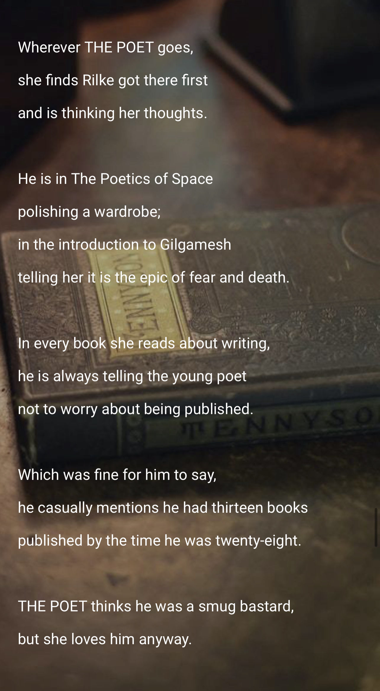 Insomnia became my friend. I joined the 3 AM club. My mind was incredibly fertile and I was in tune with my unconscious more easily when everyone else was asleep. I dreamed vividly and used the images and metaphors in my creative work. My random, repetitive, revolving thoughts became rhythms and rhymes. Sleep deprivation induced an altered state of consciousness that was almost magical, dreams and reality merged together and became poetry and art. Where there black hooded things on the landing? It didn’t really matter they became part of my art. I explored my own psyche and sexuality, examined ideas of quantum psychics, memory, and the meaning of life, (amongst other things) all from the comfort of my own bed. It was amazing, frustrating, tiring and exhilarating all at once, and became the inspiration for my poetry collection Rilke Tattoo (Wild Women Press 2006)